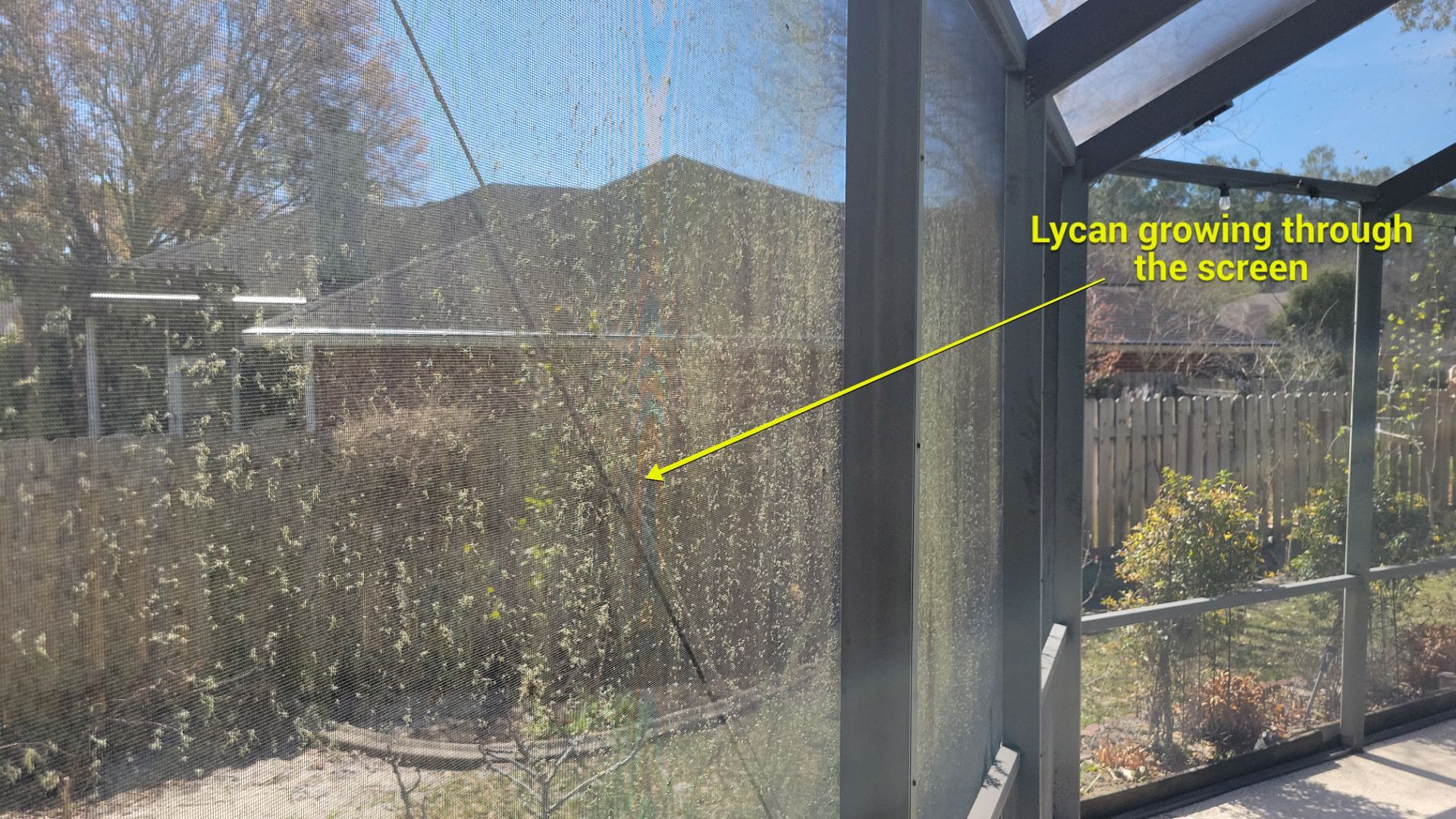 - The screen enclosure was covered in lichen, moss, and vines that had grown through the screen panels, reducing visibility and trapping moisture against the frame