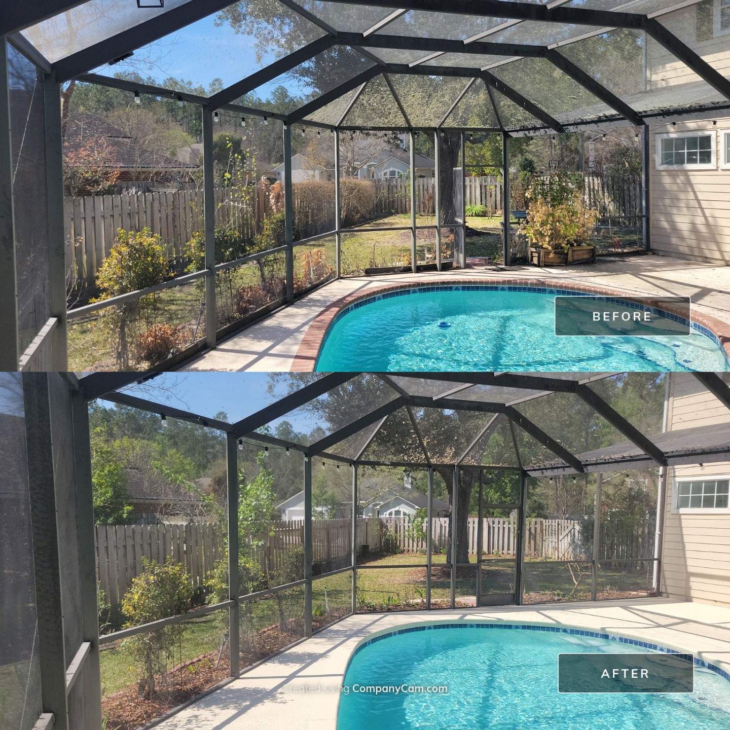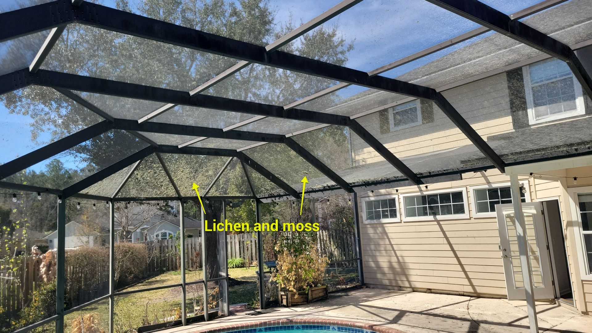 - Screen enclosure cleaned of lichen, moss, and vegetation, with noticeably improved light transmission through the panels