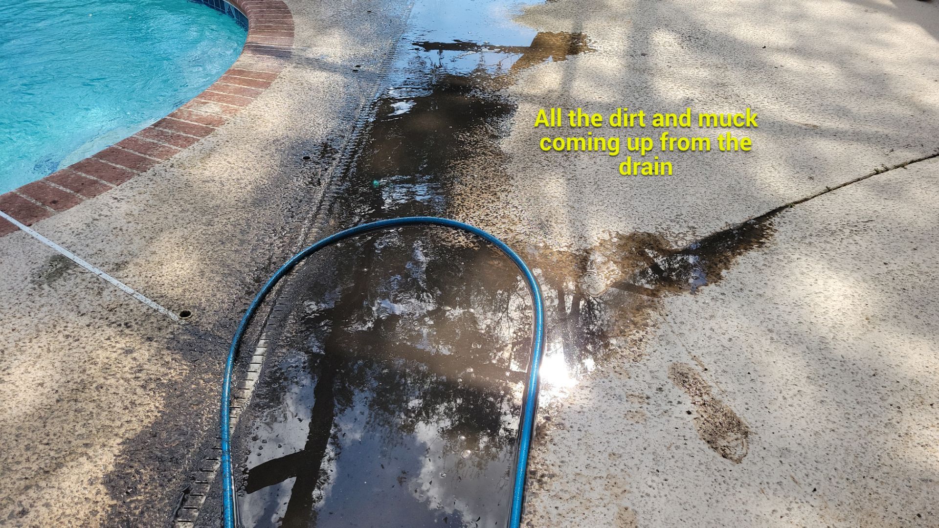 - The pool deck drain channel was completely clogged with years of compacted debris, preventing proper drainage