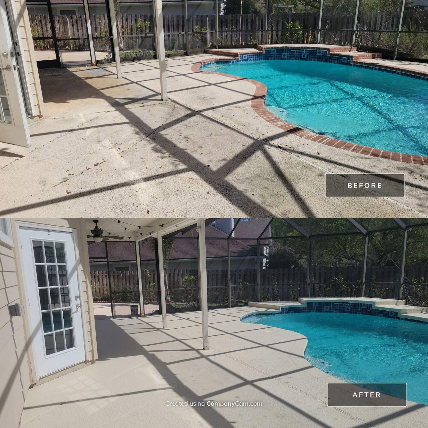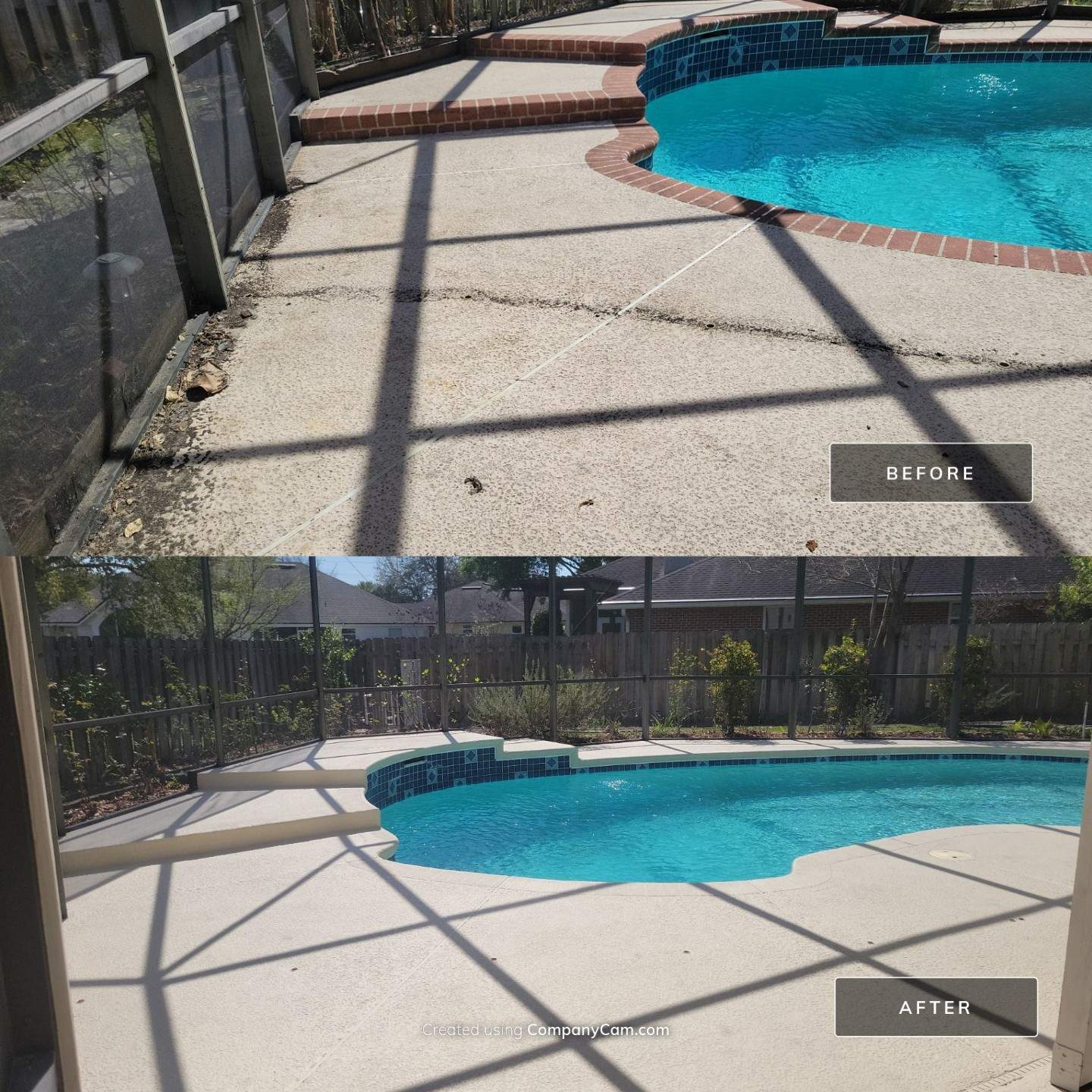 Residential Concrete completed a pool deck restoration and screen enclosure cleaning at a Jacksonville, FL home near the Greenland area. The homeowner had a concrete deck covered in a failed coating that had been deteriorating and peeling for years, a severely clogged pool deck drain, and a screen enclosure heavily soiled with lichen, moss, and vegetation growth. The goal was to restore a clean, sealed, functional surface without a full resurfacing overlay.