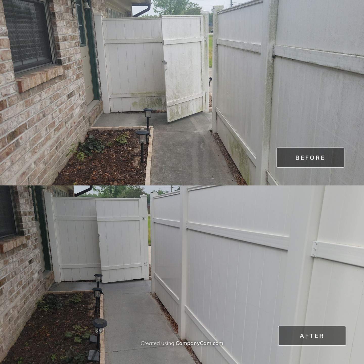 - Pressure washed the vinyl fence and gate on all sides, including the side alley and front fence panels, using appropriate pressure to clean without damaging the vinyl