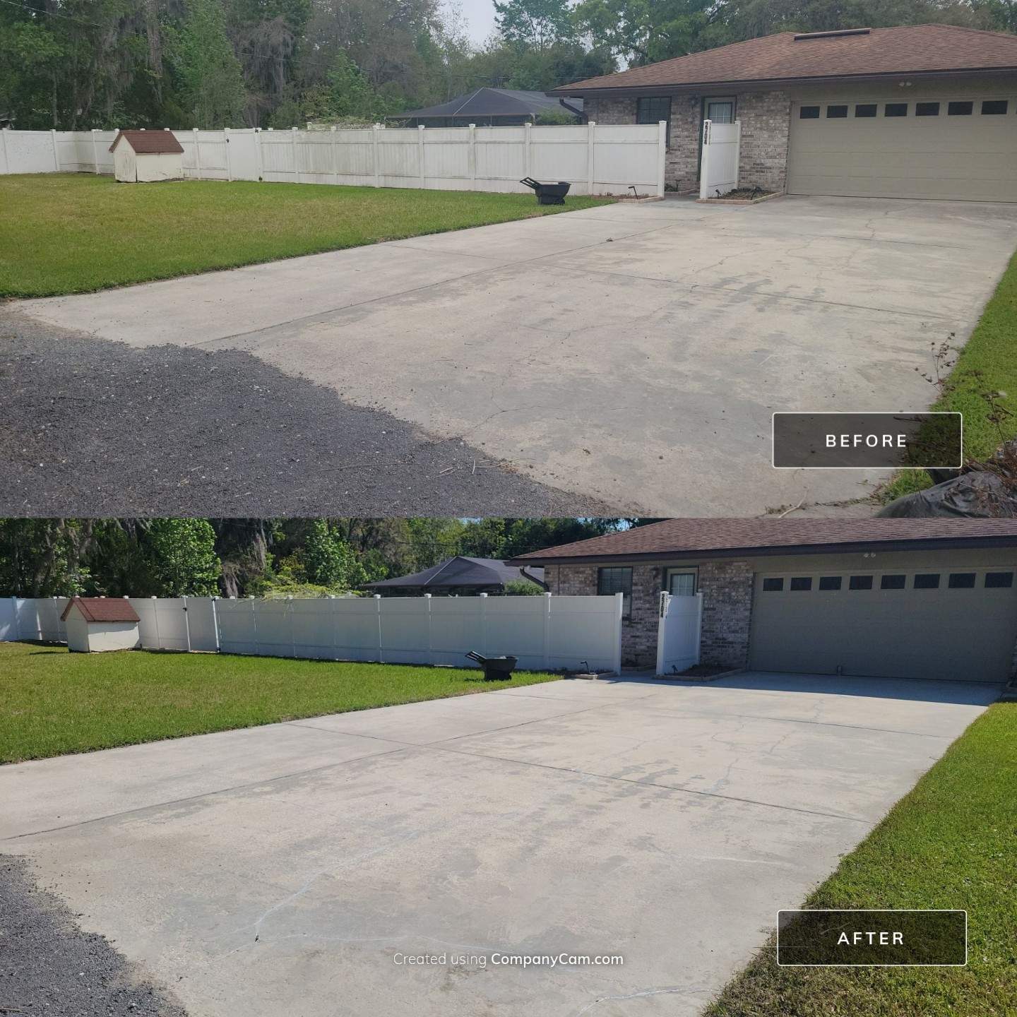 - Pressure washed the concrete driveway, removing dirt, tire marks, and staining