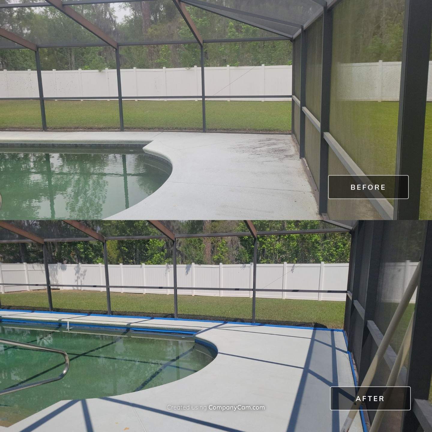 - Pressure washed the entire pool deck surface to remove algae, organic growth, and surface contamination — thorough cleaning is critical before any sealer application to ensure proper adhesion